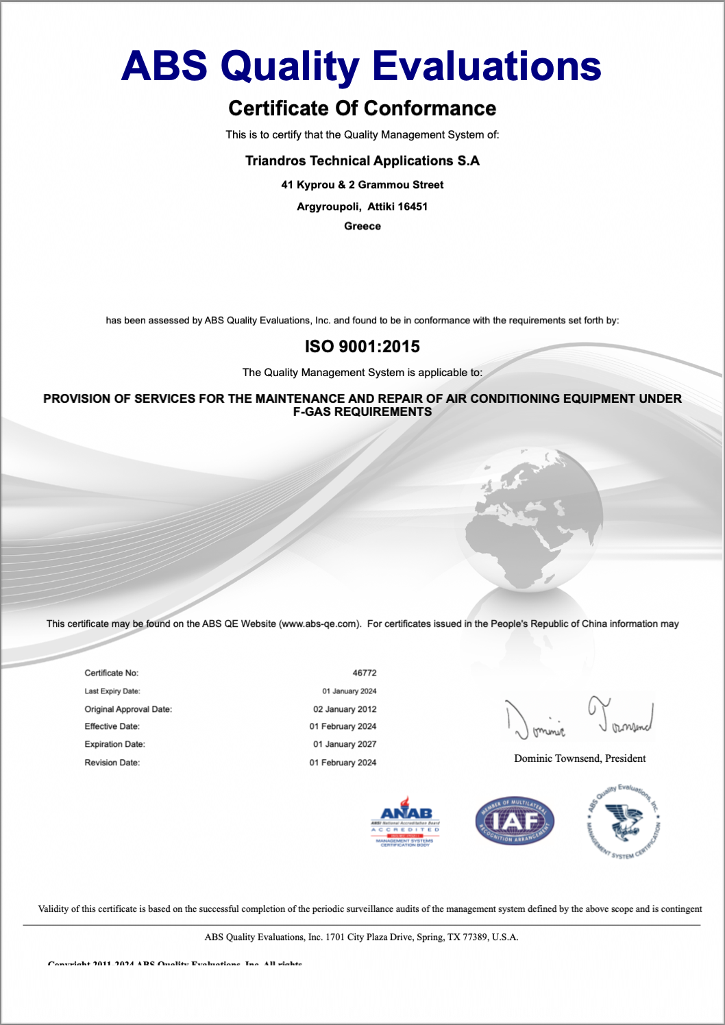 Triandros SA have been established a quality system following the standard ISO-9001:2008 from 2011 with the scope of: